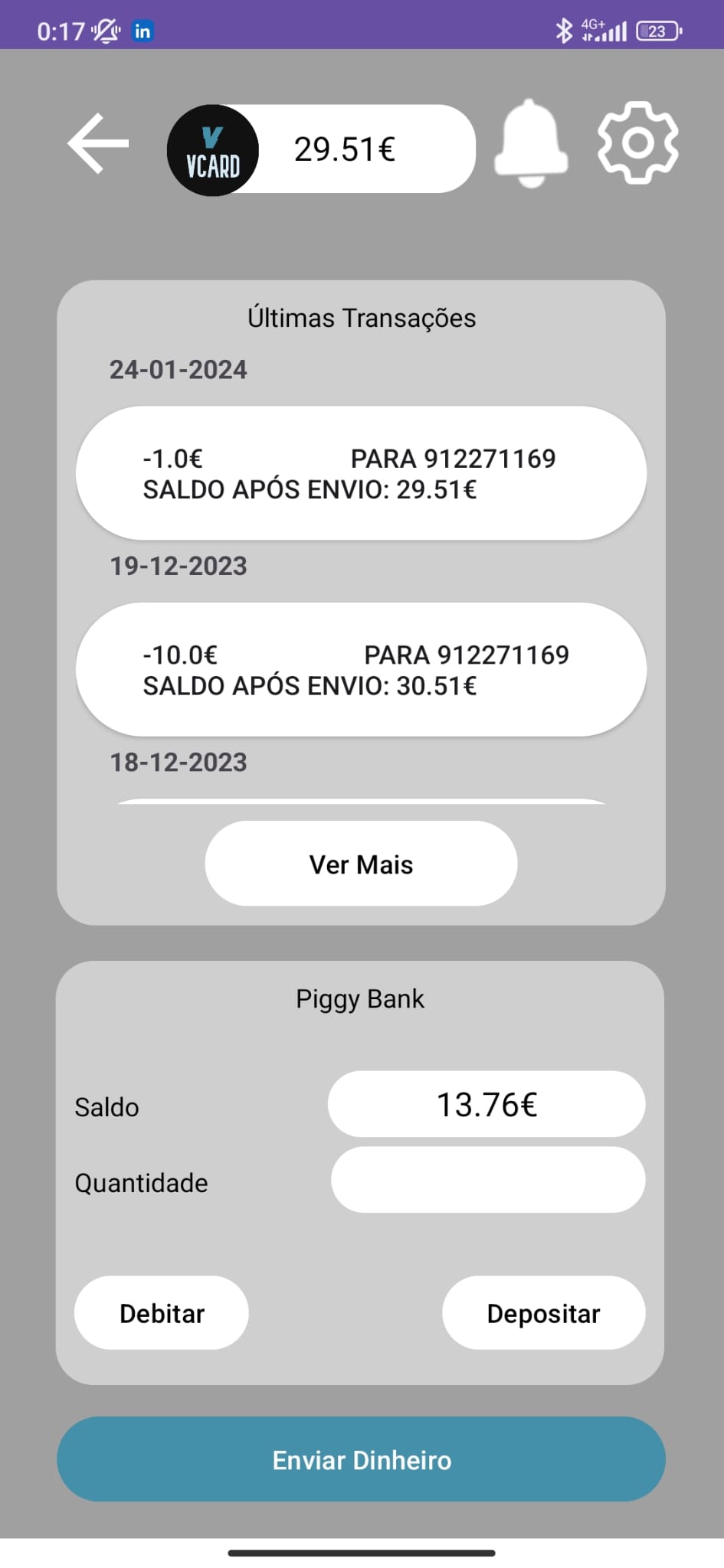 Vcard App é uma aplicação inspirada na conhecida MB WAY, trabalho proposto no âmbito da unidade curricular Tópicos Avançados de Engenharia de Software. Este projeto, desenvolvido em Java para android, utilizando ferramentas como Android Studio, Google Firebase entre outras, tem como objetivo o envio e receção de dinheiro entre os utilizadores através da App. Esta aplicação, com sistemas de segurança, login por password e PIN, permite ainda a consulta do histórico de transações, incluindo vários filtros para as mesmas, gestão de contas poupança, com features tais como arredondamento na transferência, gestão de notificações, leitura e gravação dos contactos no telemóvel, notificações em tempo real entre muitas outras.
